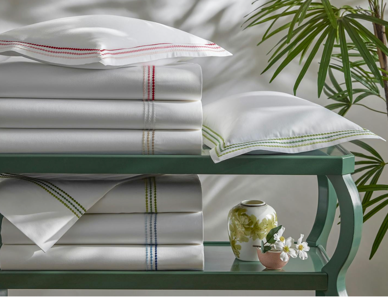 Amara Triple Pearl is a delicate embroidered design featuring a trio of pearl-shaped strands in ombré shades. The triple pearl motif lends a creative touch to lustrous Amara sateen.