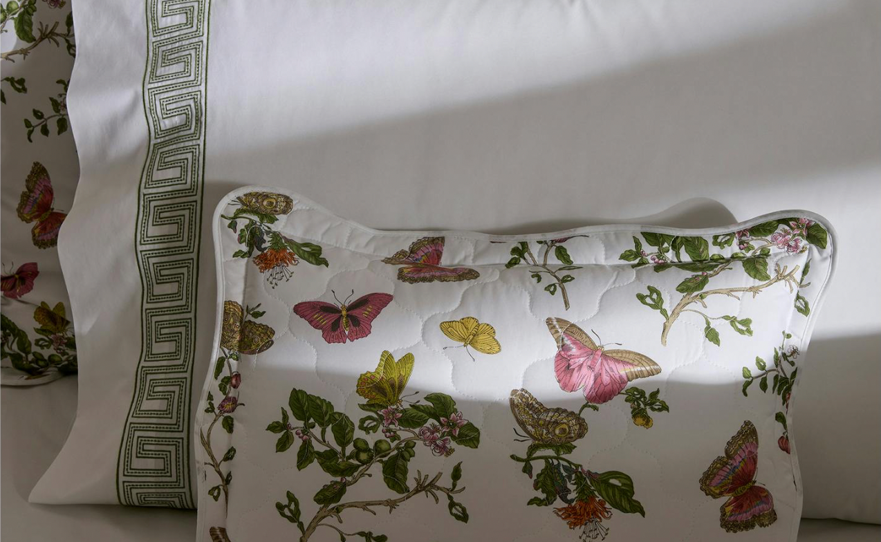 Baudin Butterfly is a delightful Matouk Schumacher print with an enchanting mix of butterfly and botanical motifs. It’s elegantly finished with a scalloped trim, adding an extra note of refinement.